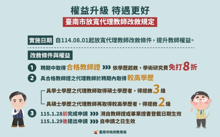發稿單位:教育局 發稿時間:114年11月4日14:15 為照顧代理教師權益,臺南市自114年8月1日起配合中央提敘規定採認職前年資,並進一步全面放寬南市代理教師「改敘」規定,代 ...更多