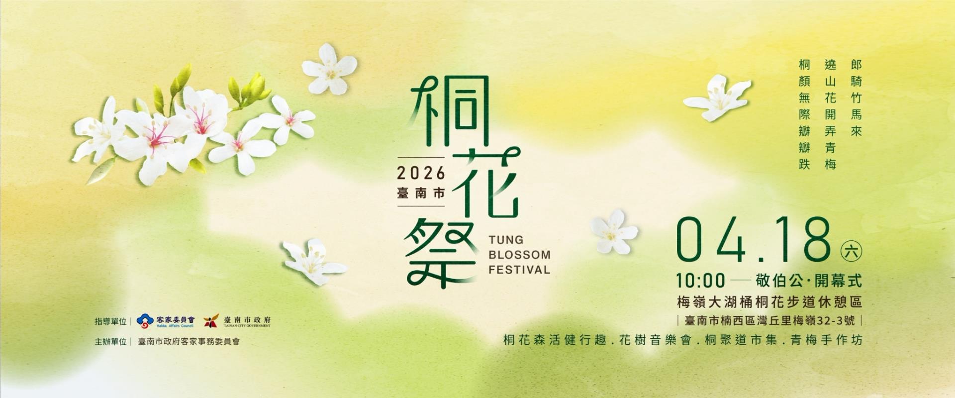 2026臺南市桐花祭即將於115年4月18日(六)浪漫登場,活動內容精采豐富,有花樹音樂會、桐聚道市集、青梅手作坊,還有季節限定的「桐花小旅行」!邀請大家共下來楠西梅嶺大湖桶步道,席地共賞桐花聆樂遶市集!