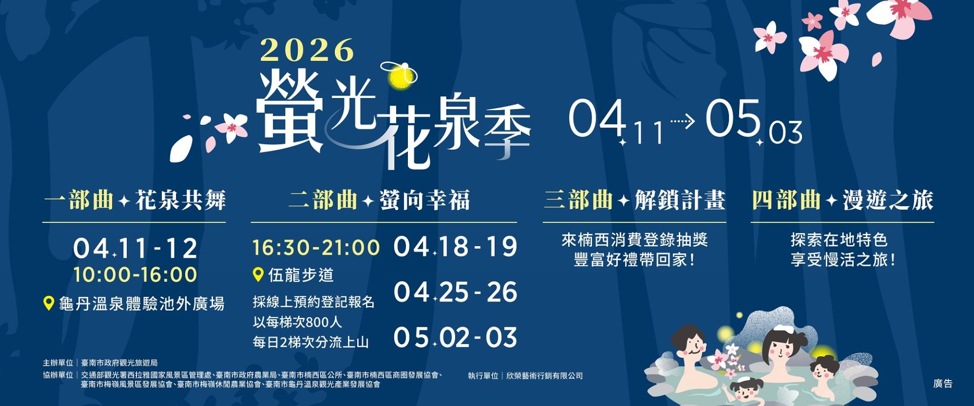 2026螢光花泉季4月11日至5月3日熱鬧登場,活動分為四部曲,邀請民眾把握春日時節,規劃一場輕鬆愜意的小旅行,享受賞花、泡湯與在地文化的多重樂趣。