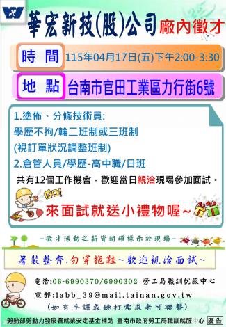 為打造黃偉哲市長「希望家園」的施政願景,勞工局積極辦理各項就業徵才活動,並因應產業求才需求,勞工局職訓就服中心將於115年4月17日(週五)下午2時至3時30分辦理「華宏新技股份有限公司」廠內徵才活動 ...更多